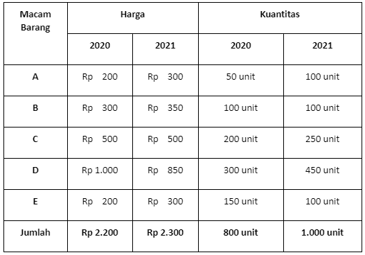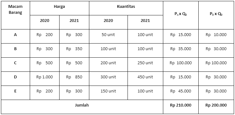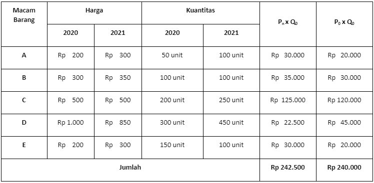 Berdasarkan data di atas, maka indeks Laspeyres (IL) dapat dihitung sebagai berikut.