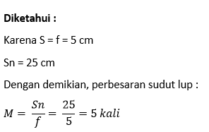 Benda diletakkan di depan lup pada jarak 5 cm. Jika jarak titik fokus lup 5 cm, berapakah perbesaran sudut lup tersebut ?