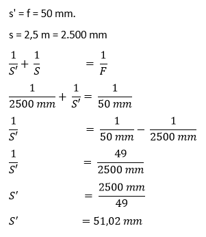 Jarak fokus lensa sebuah kamera adalah 50 mm. Kamera tersebut diatur untuk memfokuskan bayangan benda pada jauh tak terhingga. Berapa jauh lensa kamera harus digeser agar dapat memfokuskan bayangan benda yang terletak pada jarak 2,5 m?