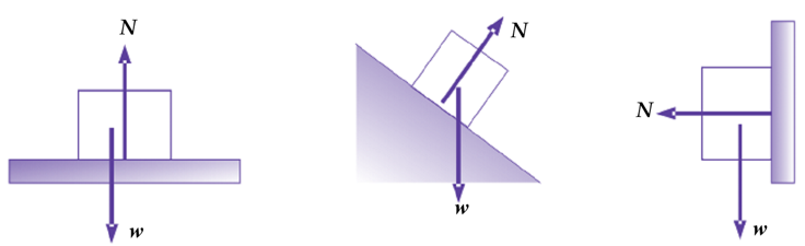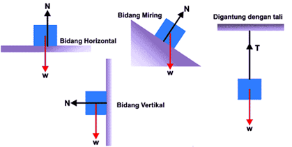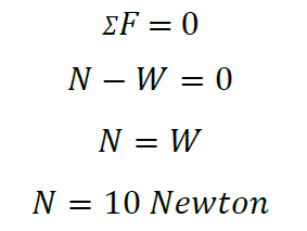 Hukum I Newton menyatakan bahwa jika benda diam maka resultan gaya yang bekerja pada benda = 0. Terdapat gaya berat (w) yang arahnya ke bawah. Karena balok diam maka harus ada sebuah gaya berarah ke atas yang mengimbangi gaya berat sehingga resultan gaya bernilai nol. Gaya berarah ke atas yang mengimbangi gaya berat adalah gaya normal (N). Secara matematis :