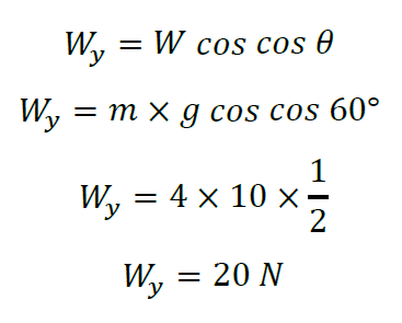 Sebuah benda bermassa 4 kg berada pada bidang miring licin dengan sudut 60 derajat. Jika g = 10 m/s2. Berapakah berat benda terhadap sumbu y?