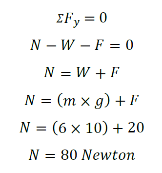 Sebuah benda bermassa 6 kg mendapat gaya dorong sebesar 20 N. Jika percepatan gravitasi bumi g = 10 m/s2. Berapakah besar gaya normal yang bekerja benda tersebut?