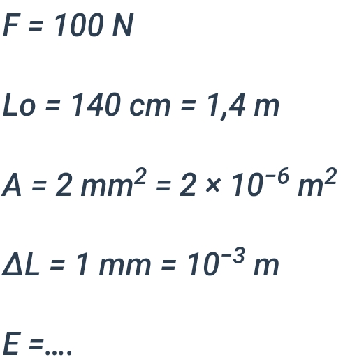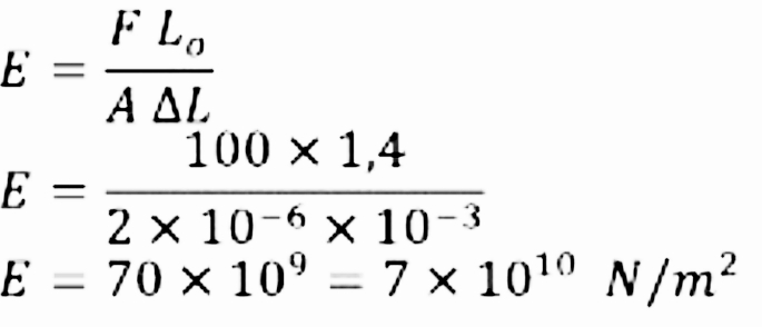 Sepotong kawat logam homogen dengan panjang 140 cm dan luas penampangnya 2 mm^2 ketika ditarik dengan gaya sebesar 100 N bertambah panjang 1 mm. Modulus elastik bahan kawat logam tersebut adalah….