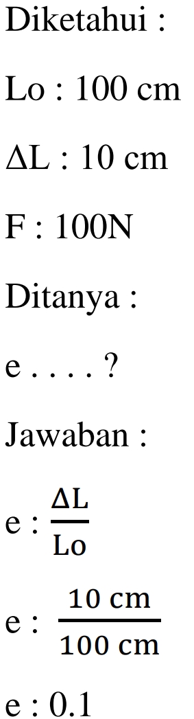 Sebuah kawat yang panjangnya 100 cm ditarik dengan gaya 100 Newton. Yang menyebabkan pegas bertambah panjang 10 cm. Tentukan regangan kawat !