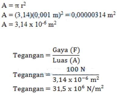Tali nilon berdiameter 2 mm ditarik dengan gaya 100 Newton. Tentukan tegangan tali!