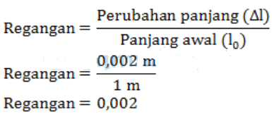 Jadi, regangan merupakan perbandingan antara pertambahan panjang kawat dalam x meter dengan panjang awal kawat dalam x meter. Regangan dapat terjadi dikarenakan gaya yang diberikan pada benda ataupun kawat tersebut dihilangkan, sehingga kawat kembali ke bentuk awal.
