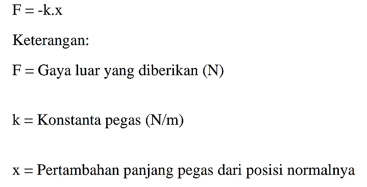 Jika gaya tarik yang diberikan pada sebuah pegas tidak melampaui batas elastis bahan maka pertambahan panjang pegas berbanding lurus/sebanding dengan gaya tariknya