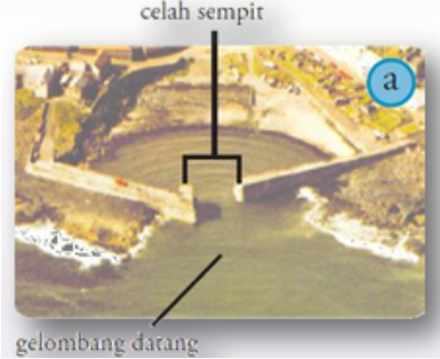 Gambar tersebut merupakan contoh kasus yang menerapkan sifat gelombang cahaya difraksi yakni kecenderungan gelombang yang dipancarkan dari sumber melewati celah yang terbatas untuk menyebar ketika merambat.