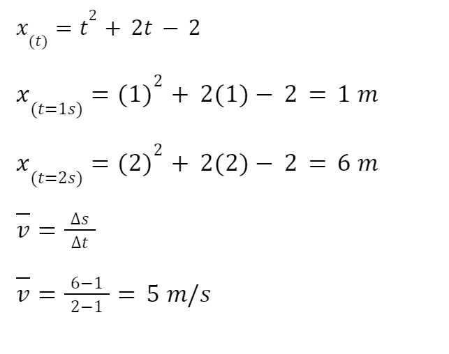 Sebuah benda bergerak dengan mengikuti persamaan x = t2 + 2t – 2. Diketahui x adalah perpindahan yang ditempuh benda (dalam meter) dan t adalah waktu tempuh (sekon). Berapakah kecepatan rata-rata pada saat t = 1 s dan t = 2 s ?