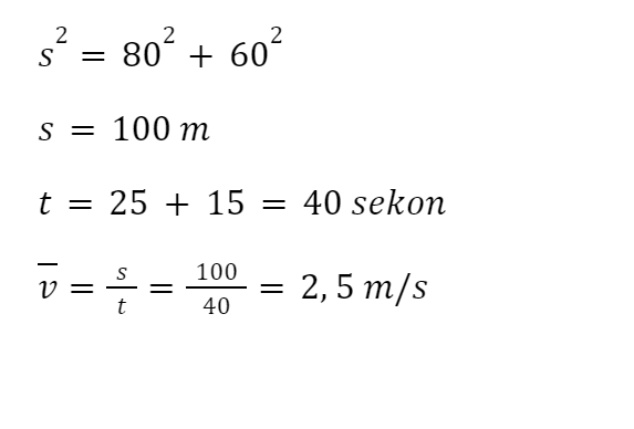 Aura diminta berlari di lapangan sepak bola. Dari titik pojok lapangan sekolah dia berlari ke Timur hingga sejauh 80 m dalam waktu 25 sekon. Kemudian melanjutkan ke arah utara hingga sejauh 60 m dalam waktu 15 sekon. Berapakah kecepatan rata-rata Aura ?