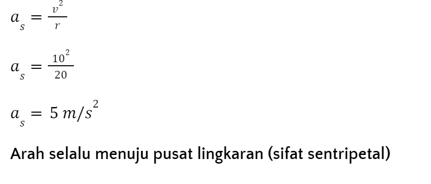 Sebuah mobil mengitari lintasan melingkar mendatar dengan jari-jari 20 m dan kelajuan tetap 10 m/s. Percepatan mobil adalah ....