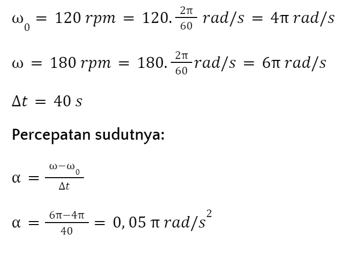 Partikel yang berputar pada lintasan melingkar berubah kecepatan sudutnya dari 120 rpm menjadi 180 rpm dalam 40 sekon. Berapakah percepatan sudut gerak partikel itu? (n=phi)