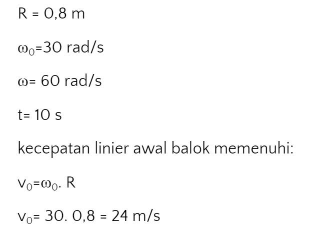 Balok berada di tepi meja putar yang memiliki jari-jari 0,8 m. Meja tersebut berputar dengan kecepatan sudut 30 rad/s. Kemudian meja mengalami percepatan sehingga kecepatan sudutnya berubah menjadi 60 rad/s setelah bergerak 10 s. Berapakah kecepatan linier awal balok kecil tersebut?