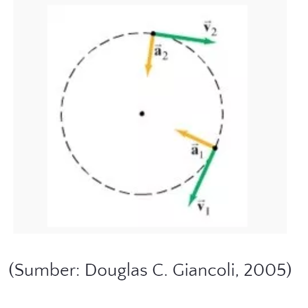 Pada gerak melingkar, terdapat suatu percepatan pada objek yang mengarah ke pusat titik lintasan yang dinamakan percepatan sentripetal yang mana arahnya tegak lurus dengan arah kecepatan linear. Perhatikan gambar dibawah.