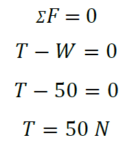 Sebuah balok bermassa 5 kg ( berat w = 50 N ) digantung dengan tali dan diikatkan pada atap. Jika balok diam maka berapakah tegangan talinya?
