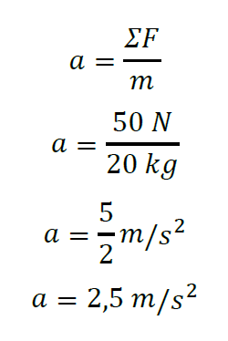 Sebuah benda bermassa 20 kg berada di atas lantai datar yang licin. Apabila gaya sebesar 50 N bekerja pada benda dengan arah mendatar selama 4 sekon. Berapakah besar percepatan yang dialami benda?