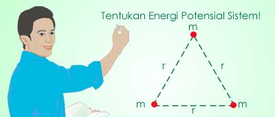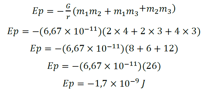 Jika massa benda pertama, kedua, dan ketiga berturut-turut adalah 2 kg, 4 kg, dan 3 kg, maka tentukan besar energi potensial sistem tersebut!