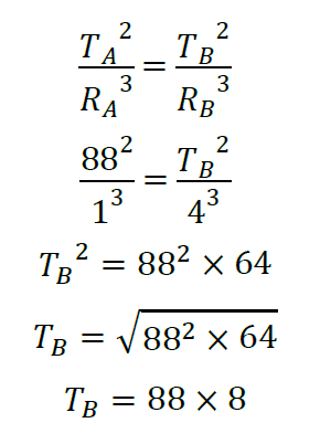 Dua planet A dan B mengorbit matahari. Perbandingan antara jarak planet A dengan planet B ke matahari RA : RB = 1 : 4. Apabila periode planet A mengelilingi matahari adalah 88 hari maka periode planet B adalah…