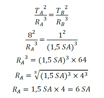 Dua planet A dan B mengorbit matahari. Perbandingan antara periode revolusi planet A dan B mengitari matahari adalah 8 : 1. Apabila jarak planet B ke matahari 1,5 SA (SA = Satuan Astronomi) maka jarak planet A ke matahari adalah…