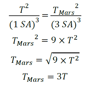 Jarak Bumi Matahari = 1 SA sedangkan jarak Mars Matahari 3 SA. Bila periode revolusi bumi adalah T, maka periode revolusi Mars adalah…
