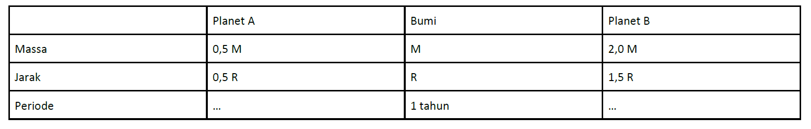 Data fisis planet A, planet B, dan planet Bumi terhadap Matahari terlihat seperti tabel dibawah ini