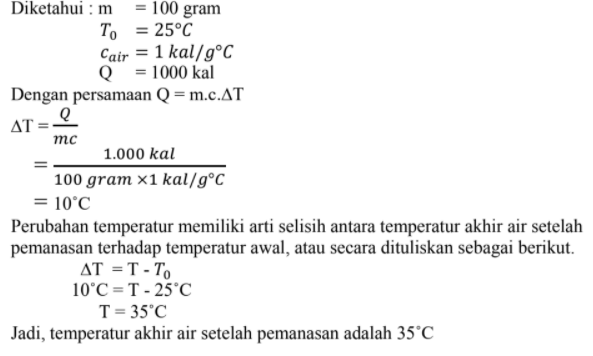 Air sebanyak 100 gram memiliki temperatur 25 derajat C dipanaskan dengan energi 1000 kalori. Berapakah temperatur air setelah pemanasan jika diketahui kalor jenis air 1kal/g derajat C?