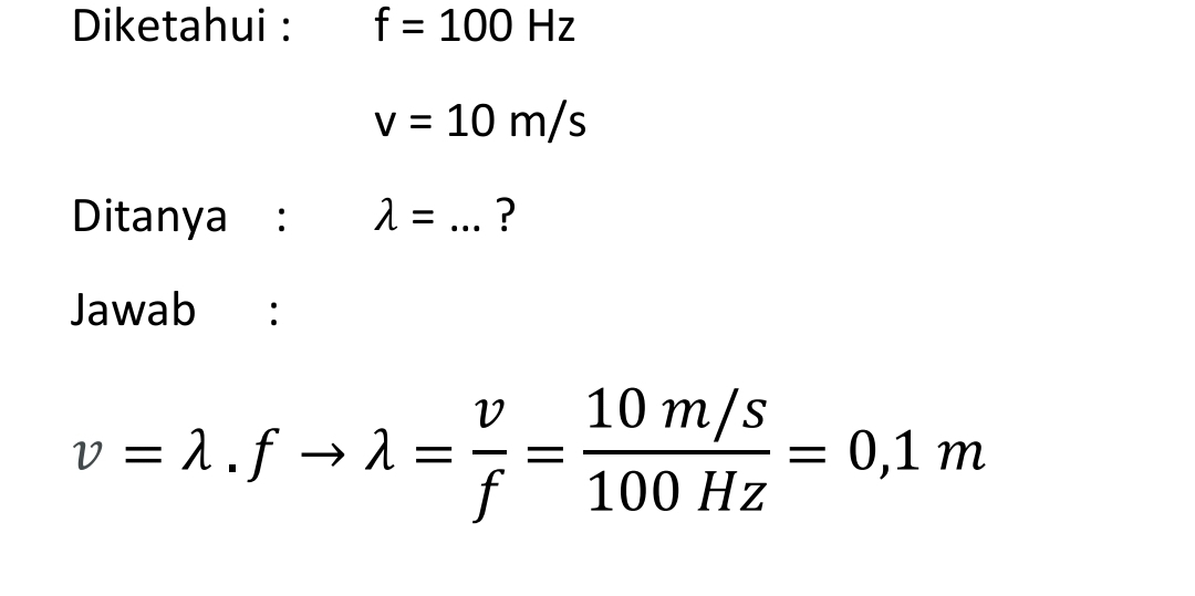 sebuah gelombang memiliki frekuensi sebesar 100 Hz dengan kecepatan perambatan sebesar 10 m/s. Maka panjang gelombang tersebut adalah …