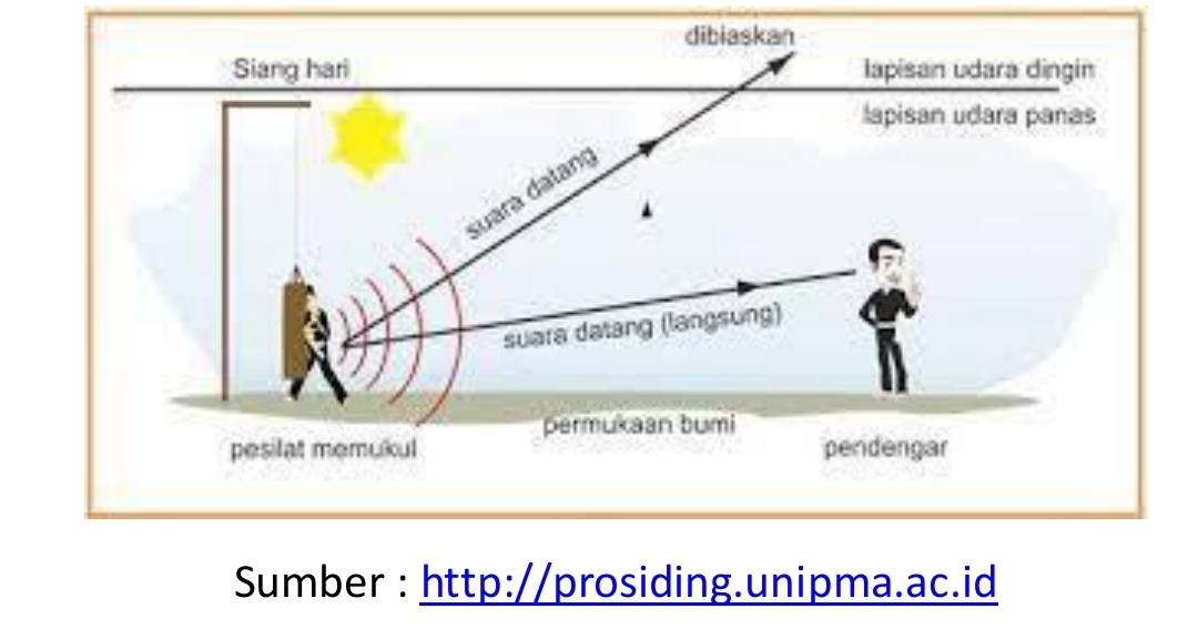 - Ketika merambat dari suatu medium ke medium yang berbeda, gelombang bunyi mengalami pembiasan atau pembelokkan arah rambatan. Pembiasan terjadi ketika gelombang mulai memasuki medium yang berbeda.