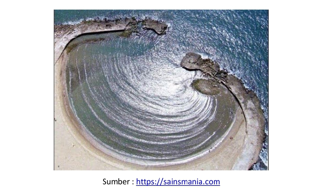 Celah bertindak sebagai sumber gelombang berupa titik dan gelombang yang melalui celah dipancarkan berbentuk. lingkaran dengan celah tersebut sebagai pusatnya. Contohnya yaitu aliran air sungai yang mengalami celah kecil cenderung putus aliran