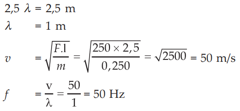 Seutas dawai yang panjangnya 2,5 m, massanya 250 gram diberi tegangan 250 N. Kemudian dipetik sehingga pada dawai tersebut membentuk pola 2,5 gelombang. Tentukan berapa Hz frekuensi nada yang dihasilkan !