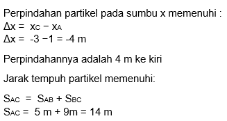 Sebuah partikel bergerak dari titik A menuju titik B kemudian menuju titik C pada sumbu koordinat seperti gambar di bawah. Berapakah perpindahan dan jarak tempuh partikel dari A hingga C ?