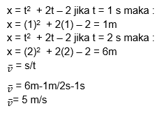 Sebuah benda bergerak dengan mengikuti persamaan x = t2 + 2t – 2. Diketahui x adalah perpindahan yang ditempuh benda (dalam meter) dan t adalah waktu tempuh (sekon). Berapakah kecepatan rata-rata pada saat t = 1 s dan t = 2 s ?