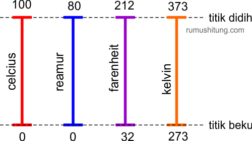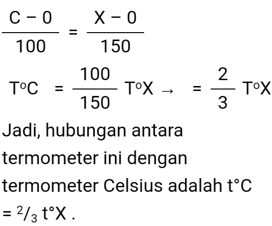Pada termometer X, rentang temperatur yang dimilikinya, yakni dari 0°X – 150°X sehingga skala pada termometer ini dibagi dalam 150skala. Perbandingan antara termometer X dan termometer Celsius, yakni: