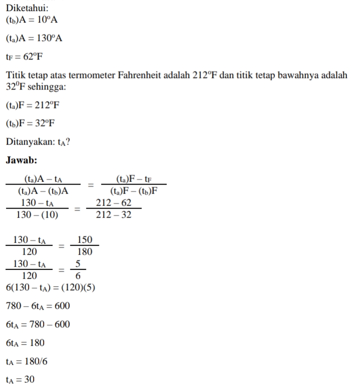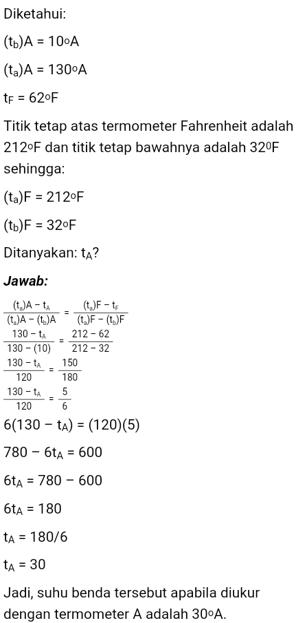 Suhu es yang sedang melebur dan suhu air mendidih apabila diukur dengan termometer A masing-masing besarnya 10°A dan 130°A.Suhu suatu benda diukur dengan termometer skala Fahrenheit sebesar 62°F. Berapa suhu benda tersebut jika diukur dengan termometer A?