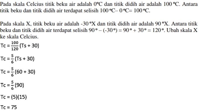 Termometer X yang telah ditera menunjukkan angka -30° pada titik beku air dan 90°pada titik didih air. Suhu 60°X sama dengan …