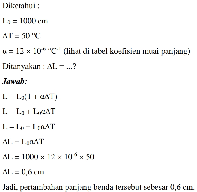 Sebuah benda yang terbuat dari baja memiliki panjang 1000 cm. Berapakah pertambahan panjang baja itu, jika terjadi perubahan suhu sebesar 50°C?