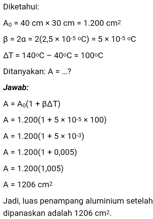 Sekeping aluminium dengan panjang 40 cm dan lebar 30 cm dipanaskan dari 40°C sampai 140°C. Jika koefisien muai panjang aluminium tersebut (alfa) adalah 2,5x105 °C, tentuan luas keping aluminium setelah dipanaskan.!