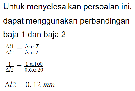 Terdapat sebuah baja yang memiliki panjang 1 m, kemudian baja bertambah panjang 1 mm. Saat suhunya dinaikkan sebesar 100o C, berapakah pertambahan panjang batang baja lain yang memiliki panjang 60 cm jika suhunya bertambah 20oC ?