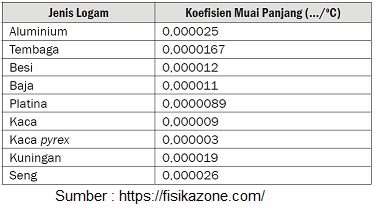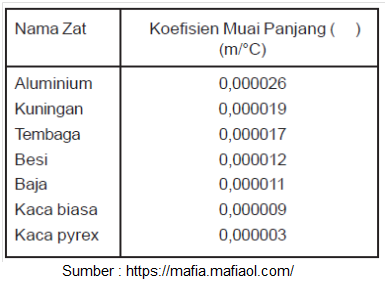 Berikut koefisien muai panjang berbagai zat pada suhu kamar :