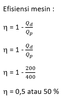 Terdapat sebuah mesin panas yang menyerap panas 400 J dari tandon panas, kemudian melakukan usaha dan membuang 200 J panas ketandon dingin. Besar efisiensi mesin tersebut?