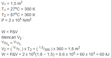 1,5 m3 gas helium yang bersuhu 27oC dipanaskan secara isobarik sampai 87oC. Jika tekanan gas helium 2 x 105 N/m2 , gas helium melakukan usaha luar sebesar....