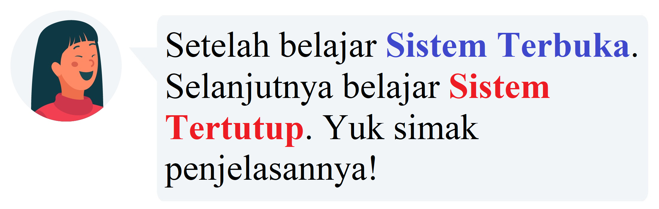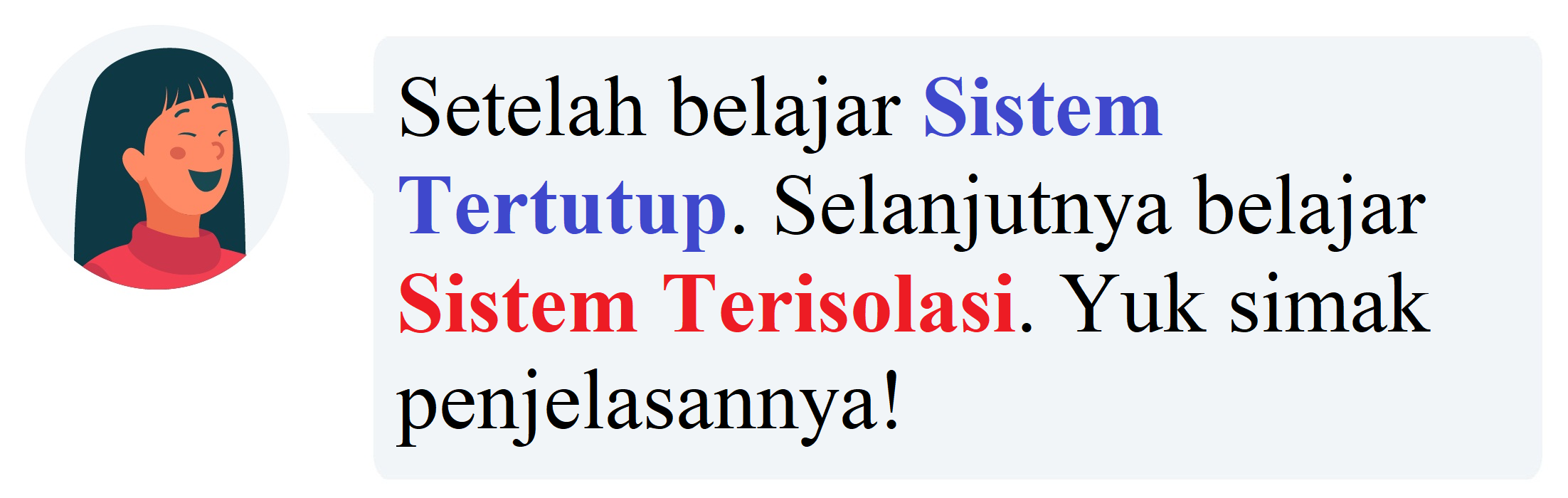 Sobat Pintar, klasifikasi sistem termodinamika berdasarkan sifat dari batasan dan arus benda, energi dan materi yang melaluinya. Ada tiga jenis sistem berdasarkan jenis pertukaran yang terjadi antara sistem dan lingkungannya. Diantaranya yakni sistem terbuka, sistem tertutup dan sistem terisolasi. Untuk pertama adalah sistem terbuka.