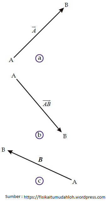 Notasi atau simbol sebuah vektor dapat menggunakan satu atau dua huruf dengan tanda panah di atasnya. Akan tetapi, dalam buku ini, vektor digambarkan oleh sebuah huruf yang dicetak tebal dan miring, misalnya A atau B. Pada gambar berikut menunjukkan gambar beberapa vektor dengan notasinya.