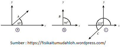 Umumnya, sudut yang menyatakan arah sebuah vektor dinyatakan terhadap sumbu-x positif. Pada gambar berikut memperlihatkan tiga buah vektor A, B, dan C dengan arah masing-masing membentuk sudut 45°, 90°, dan 225° terhadap sumbu-x positif.