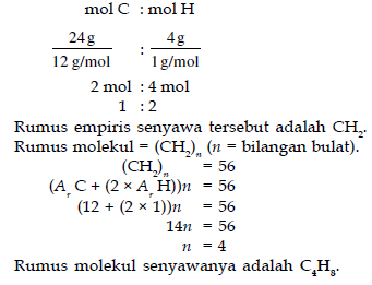 Senyawa hidrokarbon (Mr = 56) mengandung 24 g unsur karbon dan 4 g unsur hidrogen. Tentukan rumus molekul senyawa jika Ar: C = 12 dan H = 1.