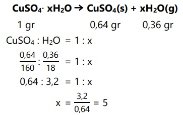 Tentukan rumus kimia hidrat 1 gram senyawa CuSO4 . xH2O yang bila dipanaskan menghasilkan 0,64 gram padatan!