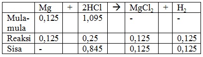 Logam magnesium dengan massa 3 gram direaksikan dengan larutan asam klorida yang mengandung HCl 40 gram. Reaksi yang terjadi adalah: