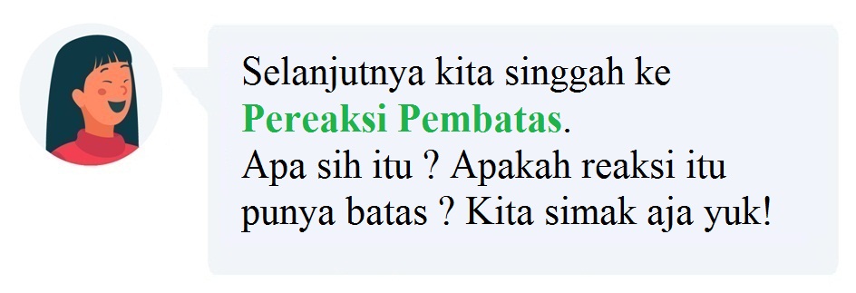 Pereaksi pembatas adalah pereaksi yang habis lebih dahulu bereaksi. Cara menentukan pereaksi pembatas adalah dengan membagi masing-masing mol zat pereaksi dengan koefisiennya. Nilai yang lebih kecil merupakan pereaksi pembatas.