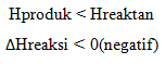 - Entalpi produk lebih kecil dibandingkan dengan entalpi reaktan sehingga harga delta H = -