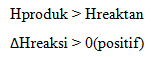 Pada reaksi endoterm, sistem menyerap energi. Oleh karena itu, entalpi akan bertambah, artinya entalpi produk (Hp) lebih besar daripada entalpi pereaksi (Hr). Akibatnya, perubahan entalpi, yaitu selisih antara entalpi produk dengan entalpi pereaksi (Hp–Hr) bertanda positif.